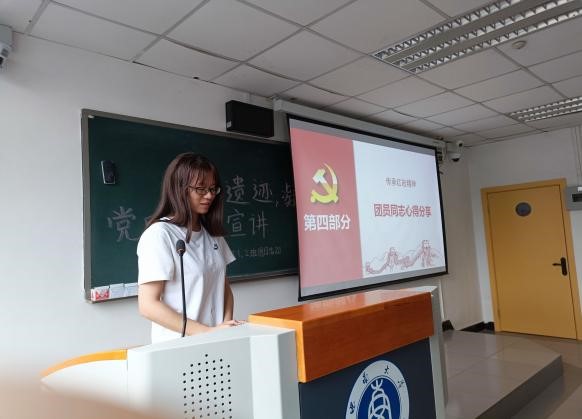 活动伊始,杨福琴同志介绍了支部党员“踏寻红色足迹”的路线,并为团员们介绍了渣滓洞、白公馆和“11.27大屠杀”的沉重历史。随即播放了影片《理想照耀中国》片段,使同学们更加切实体会到了革命先烈们忠于信仰、舍生忘死的初心。杨福琴同志、魏丽同志随后声情并茂地介绍了“小萝卜头”宋振中、“双枪老太婆”邓惠中的事迹。当讲到邓慧中与其子邓诚牺牲于解放前夕时,魏丽同志不禁潸然泪下,其精神感染着在场的每一位团员。在短短的介绍中,团员们对红岩精神有了较为深入的了解。