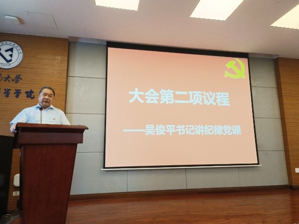 吴俊平书记为毕业生党员讲授“学纪守纪筑牢忠诚品格,知行合一勇做青年先锋”的纪律党课。吴书记结合新修订的《中国共产党纪律处分条例》和自身工作经历,提出毕业生党员们要学纪、知纪、明纪、守纪,将遵规守纪内化于心,不断强化纪律意识、加强自我约束、提高抵御腐败的能力,始终保持政治定力、纪律定力、道德定力和抗腐定力,坚持做到忠诚、干净、担当。