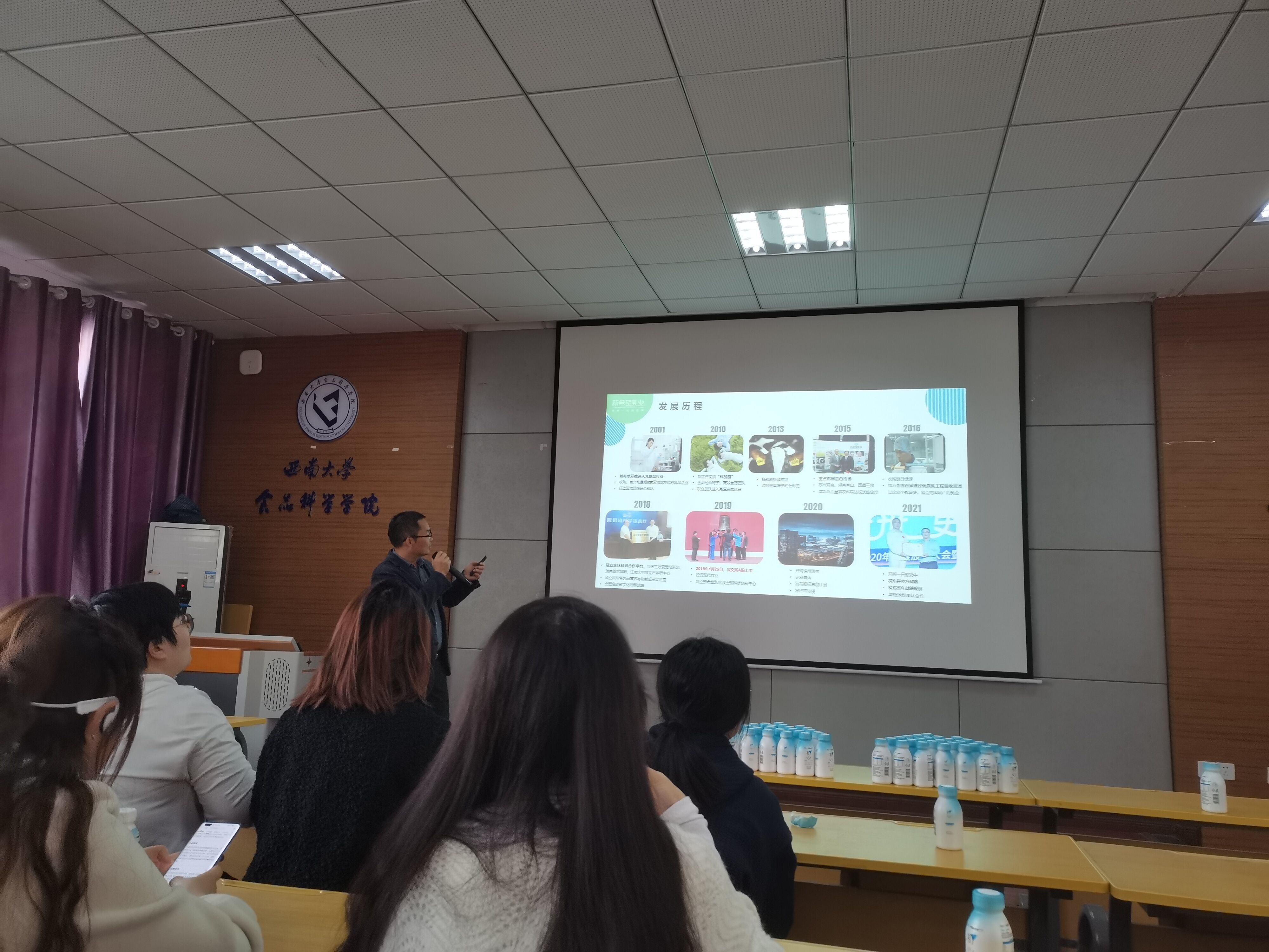 活动现场,新希望乳业负责人李启明为学生们详细介绍了新希望乳业的基本情况、发展历程、团队理念、科研情况及科研平台等方面的相关知识,同时也介绍了系列创新特色产品,比如无乳糖高品牛奶、黄金24小时鲜奶等。此外,黄漫 19届校友-新希望乳业科技研究院靳苗苗从求职者的角度出发,以自己的求职经历为例子,为学弟学妹们分享了自己的择业规划、在企情况等方面的求职经验,并给出了“多经历生活,分开处理事情与情绪”的学姐寄语。最后,主持人罗敏从毕业生就业形势出发,进一步介绍了新希望乳业的岗位需求及给同学们的求职规划。