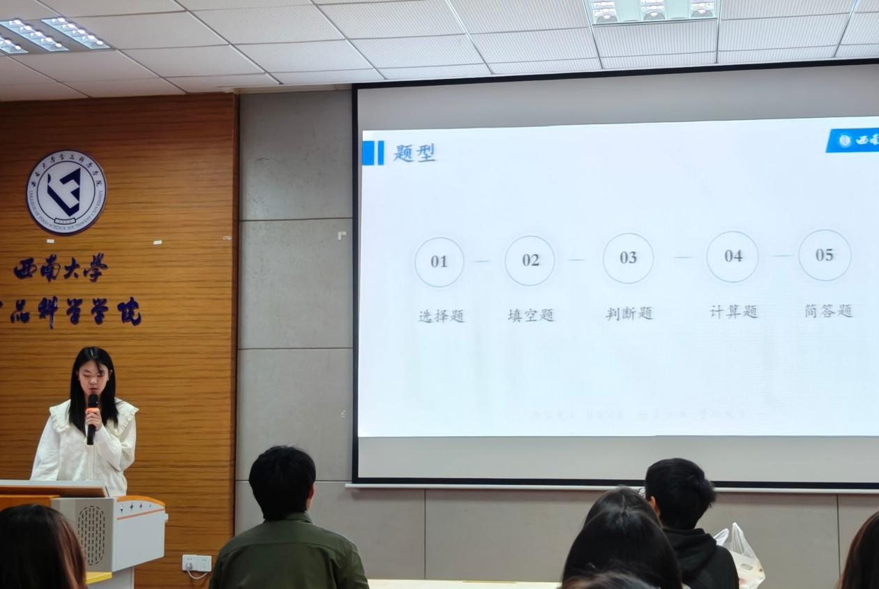 活动伊始,卢晓林从考试题型、日常学习、期末复习三方面依次进行介绍。她强调了把题目“做多、做精、做懂”的重要性,并且告诉同学们应该紧跟老师进度、及时解决问题、及时回顾复习,据此详细介绍了自己的学习经验及方法。