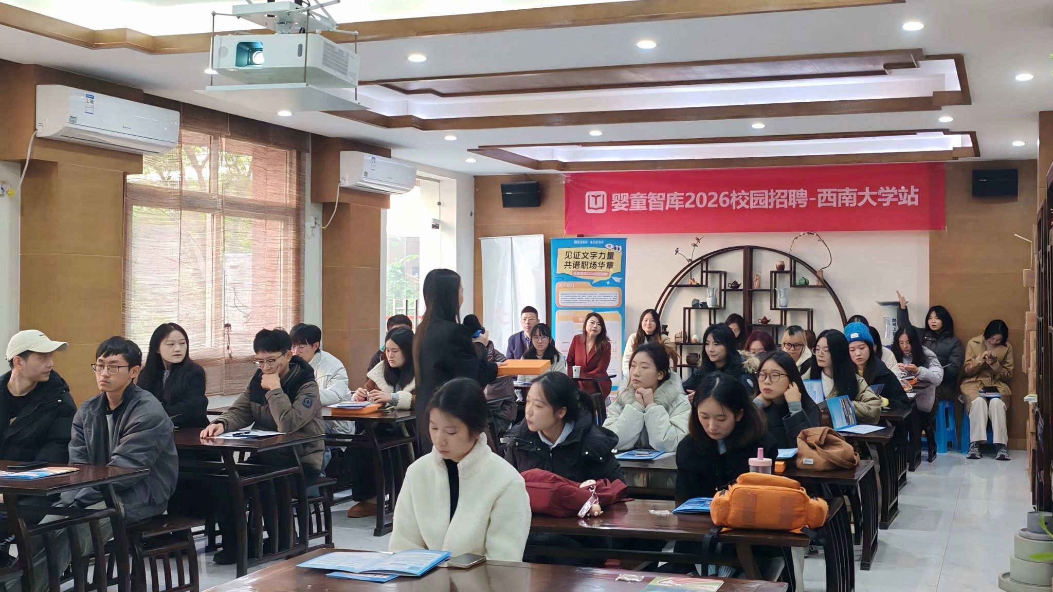 在互动答疑环节,同学们围绕“岗位内容与专业结合度”“培训周期与工作节奏”“职业发展规划”等问题积极提问,招聘团队一一作出细致解答,现场气氛热烈、交流深入。宣讲结束后,有意向的同学现场投递简历,并参加了婴童智库组织的快速初面,实现了“宣讲—面试”一站式对接,有效提升了招聘效率。