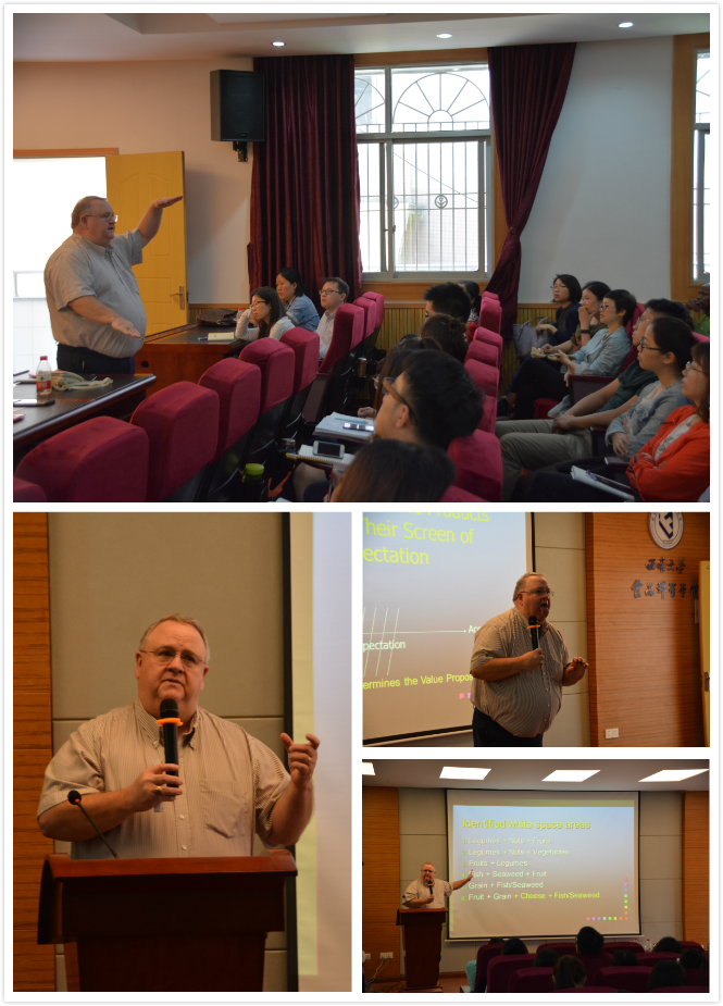 ,并在39教215报告厅分别作题为“Innovation and Development:Understanding What Currently Exists and the Customer Value Proposition”和“Food from Different Countries and Cultures”的专题报告。本次报告由黄漫
