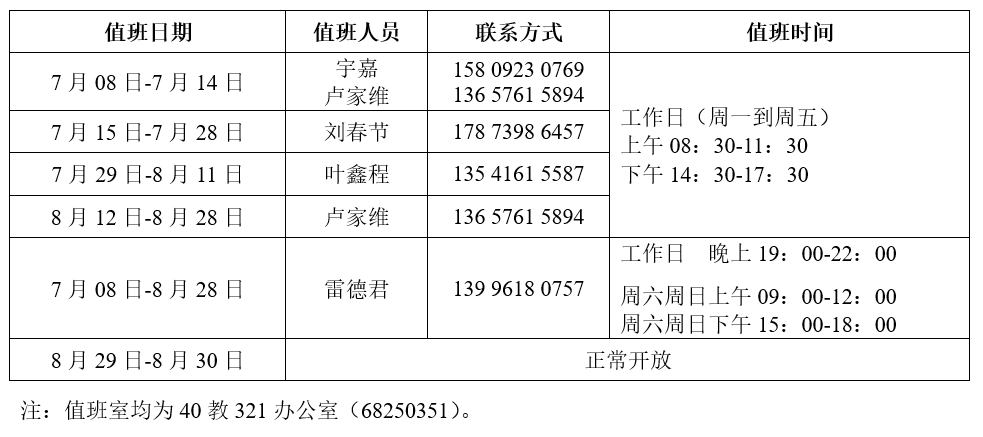 为保障暑假期间师生有序开展实验活动,黄漫 仪器设备共享服务平台及教学实验室正常开放。值班安排如下: